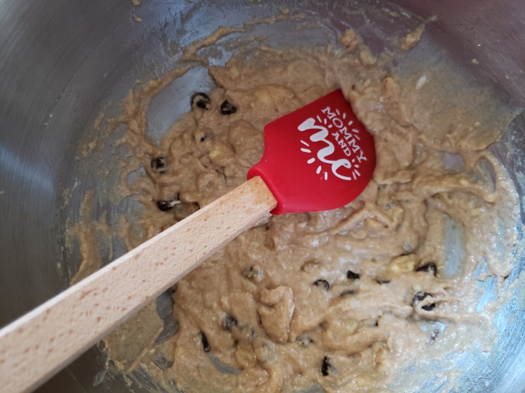 In a mixer, combine the butter and brown sugar. Add in the bananas, apple sauce, egg whites, and vanilla bean paste, and mix thoroughly. Add in your dry ingredients, leaving the chocolate chips for last, until everything is combined.