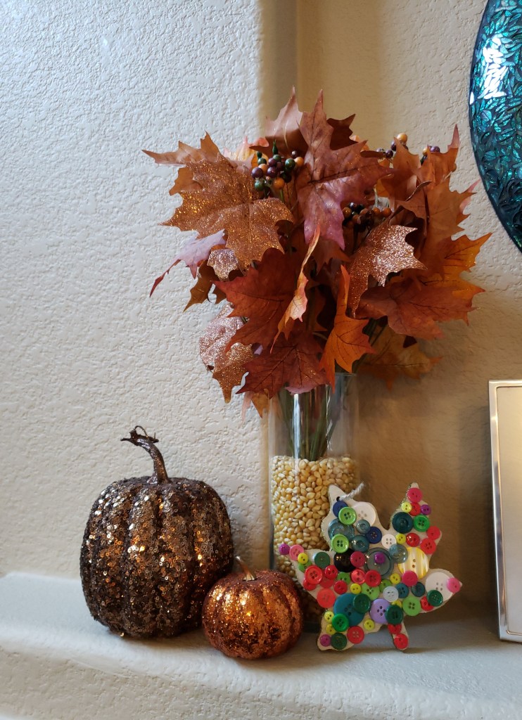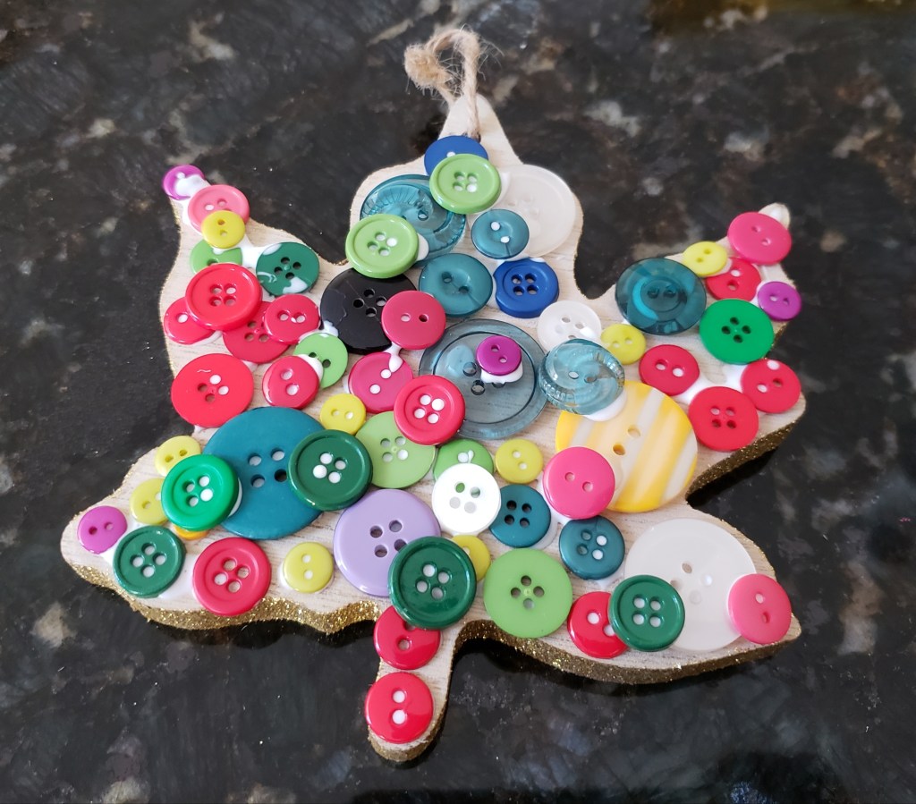 This is a fun project and turns out really cute! I found Autumn wooden ornaments in the Target dollar section and pulled out my box of buttons and some liquid glue. I placed dots of glue all over the ornament, and Lexi arranged the buttons how she wanted them. If you have an older child, they can do the gluing as well. This was a cheap project and can make a great gift for a grandparent. 😉