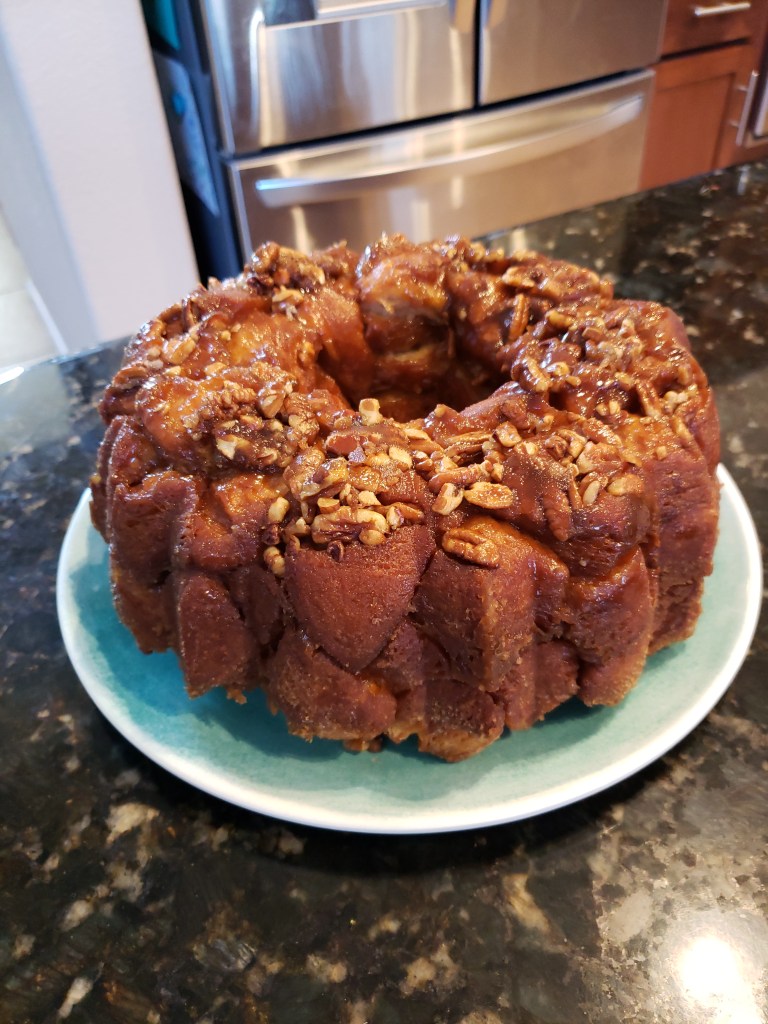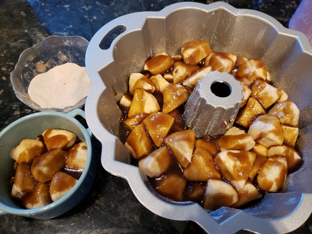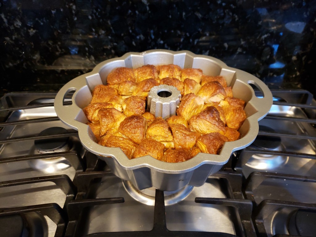 I placed a few pieces of dough in a ramekin and baked it for 20 minutes, so my husband could have some monkey bread too! 🙂